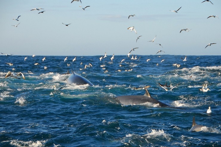 The sight of wheeling gannets folding their wings to plummet into the water around schools of dolphins surging after a boiling mass of panic-stricken sardines is an extraordinary spectacle.