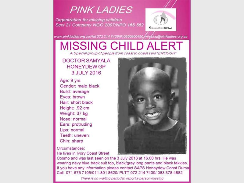 It has been two days since Doctor Samyala (aged 9 years) went missing. The little boy was last seen in Cosmo City on 3 July, wearing a navy-blue tracksuit top, black/grey long pants and black takkies. He has brown eyes, short black hair and sharp teeth. He weighs 37 kilograms and is 92 centimetres in height.
