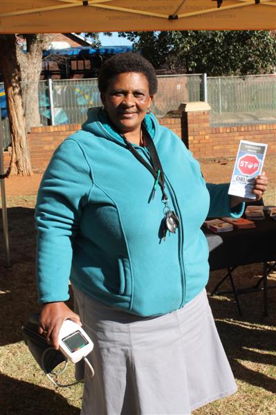 Doreen Muthwa from the Health Department with the blood pressure testing device and a health pamphlet.
