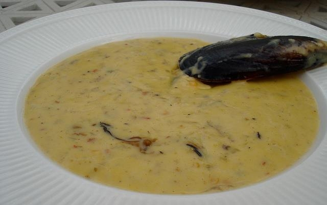 Melt the butter in a pan and sauté the garlic and onion until transparent. Add the mussels and use a fork to lightly “mince” the mussel meat. Add the sherry and fish sauce and bring to a gentle simmer. Add this mixture to the chicken soup together with the remaining oil in the tin and simmer for about 10 minutes. Add the cream and parsley and stir through.