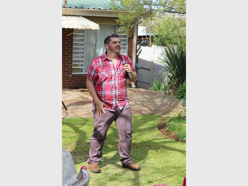 Almal het buite in die tuin gesit waar Marius Swanepoel ‘n feestelike atmosfeer geskep het met sy musiek en die bekende liedjies wat hy gesing het.