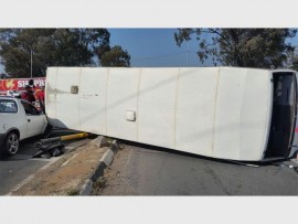 ER24 paramedics, along with other services, found a bus lying on its side while a taxi was standing in the middle of the road. Numerous occupants from the taxi and the bus were lying around the two vehicles.
