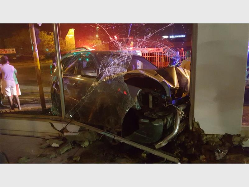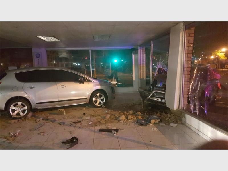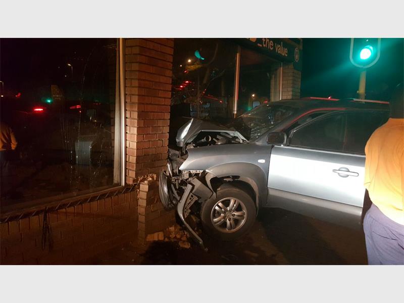 Paul Viljoen, an employee of Tiger Car Sales (which has been in Roodepoort since 1965) said the accident must have occurred sometime between 11pm on Saturday, 3 September and 1am on Sunday, 4 September. From what can be gathered, the vehicle in question was travelling on Dumat Street, from Ontdekkers Road, when the driver swerved out for pedestrians and lost control of his vehicle. In spite of attempting to avoid the pedestrians, he struck two of them and then crashed through the showroom window at the car dealership on the corner of Olivier Street. The driver fled on foot. Both pedestrians were injured, one of them critically.