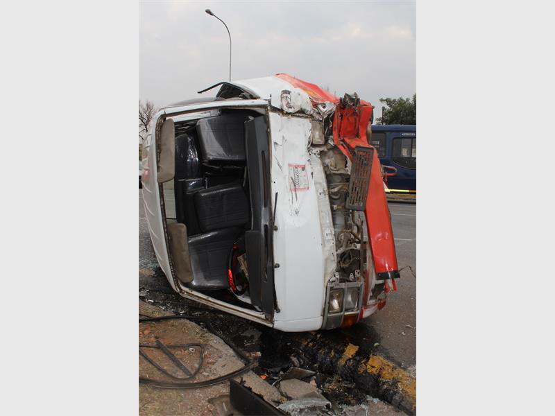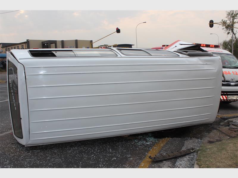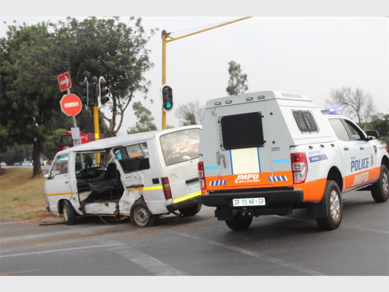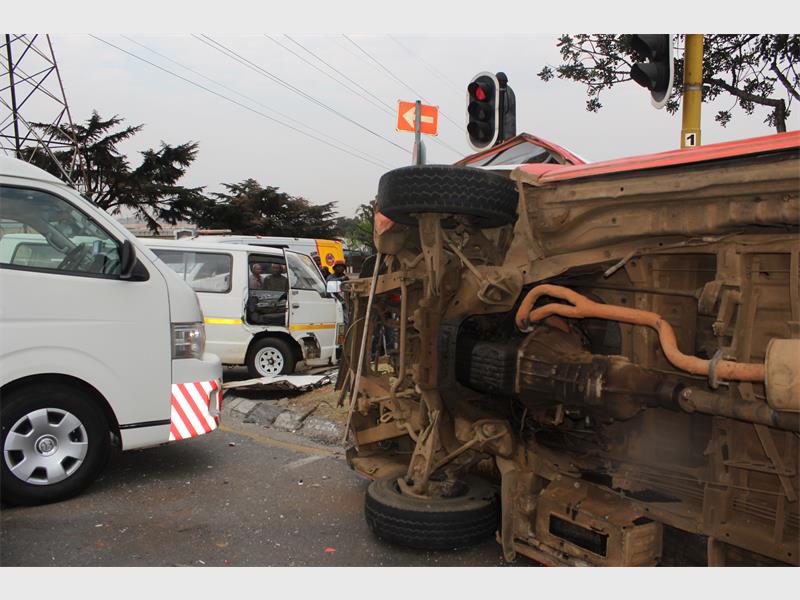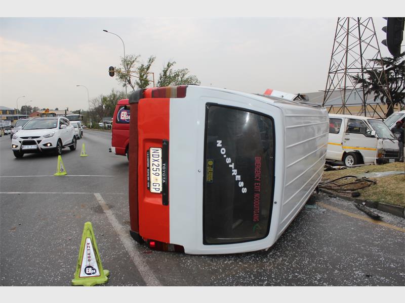 It is alleged that one taxi skipped a red traffic light and T-boned another taxi, causing it to roll. JMPD officials were on scene investigating while various emergency services such as ER24, Netcare 911 and Joburg EMS took care of patients.