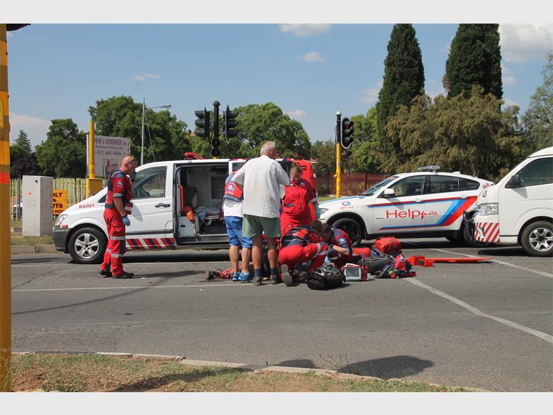 At this stage it is uncertain how it happened but bystanders speculated that the truck hit the motorcycle after it had skipped the traffic light. The truck dragged the motorcycle over a distance of 60 to 70 metres. The motorcyclist’s left leg was severely injured below the left knee. While the Record was on the scene the rider was still conscious while paramedics attended to him. The road has been closed.