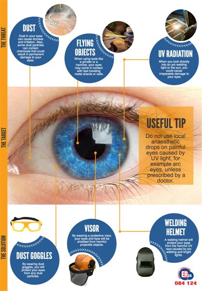 According to Doctor Vernon Wessels from ER 24, some of the defence mechanisms keeping these highly sensitive organs safe from harm include the eyelids and tears. “Tears are produced continuously at just the right volume (except when we cry), and viscosity to ensure good lubrication of the eye, clear vision and to wash away dust. Eyelids blink regularly and close within milliseconds when we sense an approaching threat. The pupil adjusts according to the incoming light to allow just enough for good vision,” Wessels said. But, even with all these natural defences, we often cause injuries and damage because of negligence.