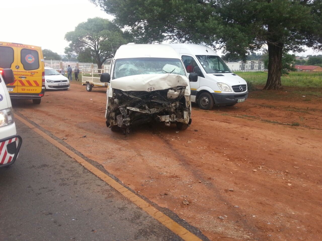 The accident took place at about 6am on Randfontein Road close to the Corlett Avenue intersection. A small truck was travelling from the direction of Johannesburg when it veered into the oncoming traffic and collided head-on with a taxi and two other vehicles. The driver of a Mazda 323 died on impact. Four other people were taken to hospital. It is speculated that the driver of the truck had fallen asleep.