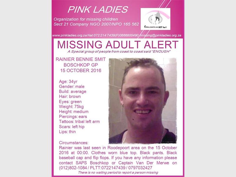 Rainier is of average build, has brown hair and green eyes, and weighs 75kg. He was last seen wearing a blue top, black pants, a black baseball cap and flip flops. If you have any information on his whereabouts, please contact the Boschkop Police or Captain Van Der Merwe on 012 802 1084/ 072 214 7439/ 079 703 2427.