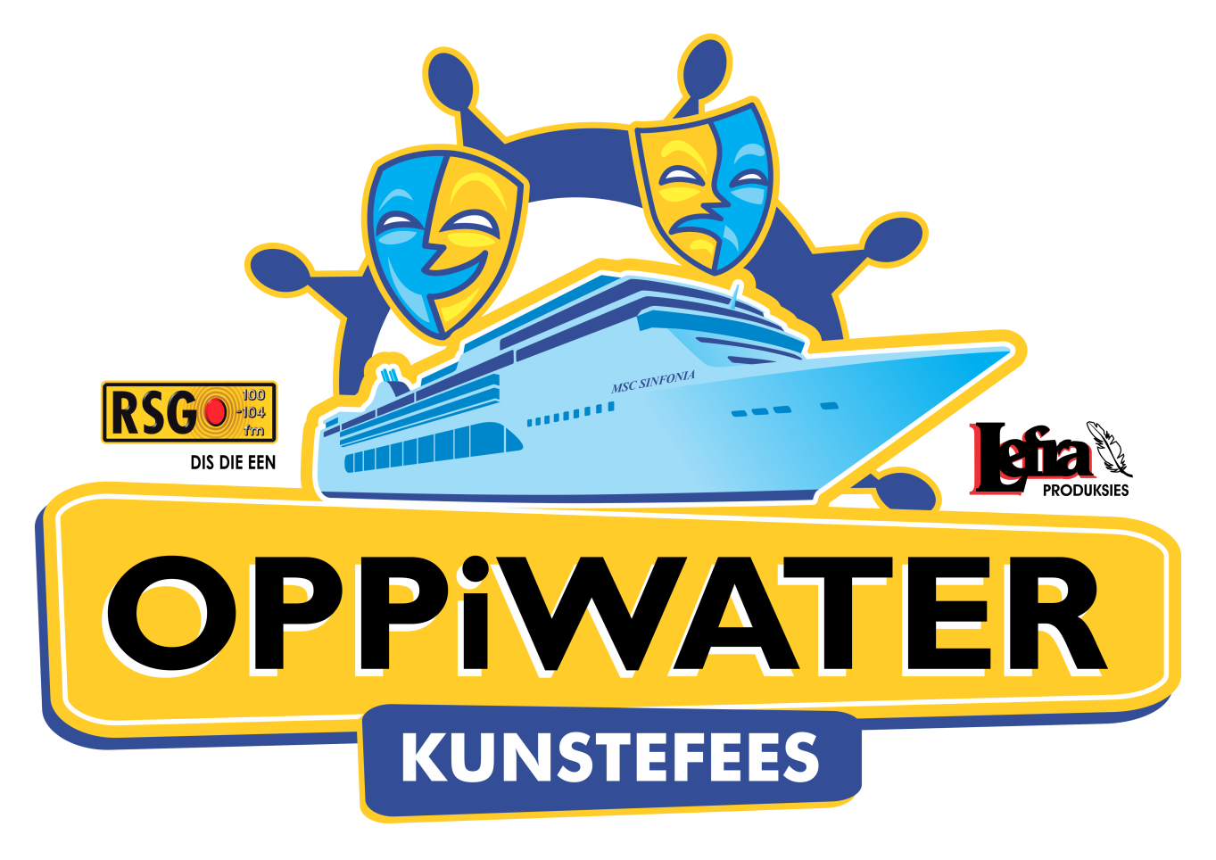 RSG en LEFRA PRODUKSIES se vierde Oppiwater Kunstefees vind volgende jaar plaas van 30 April tot 5 Mei 2017 aanboord die luukse MSC Sinfonia. Die OPPIWATER KUNSTEFEES is ‘n baie unieke kunstefees met meer as 20 verskillende Produksies wat elkeen ‘n paar keer speel in die verskeie teaters en venues op die MSC Sinfonia. Volgende jaar se OPPIWATER KUNSTEFEES vertrek vanaf Kaapstad en besoek Namibië se mooie Lüderitz en Walvisbaai. Besprekings vir volgende jaar se Oppiwater Kunstefees kan gedoen word by 0860 11 44 11 of op die webtuiste: www.oppiwater.co.za VIr meer inligting, skakel gerus vir Lefra Produksies by (011) 815 3000 of epos aan: admin@lefra.com Die OPPIWATER KUNSTEFEES word aangebied met die vriendelike samewerking en ondersteuning deur Stuttaford van Lines, McCarthy Volkswagen Arcadia, RSG en Sounds Good.