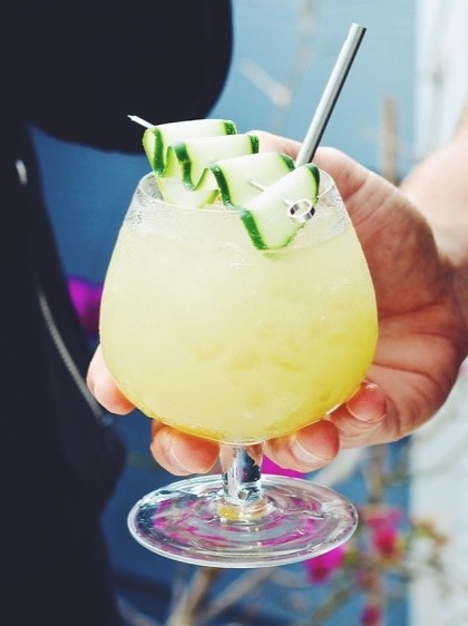 Add all liquids to cocktail shaker. Fill with ice and shake until chilled, approximately 15 seconds. If you’re a fan of absinthe, rinse the glass with it. Using a vegetable peeler, peel a long slice of the cucumber lengthwise. Place a cucumber garnish around the outside of the glass. Fill the glass with ice and add cocktail mixture.