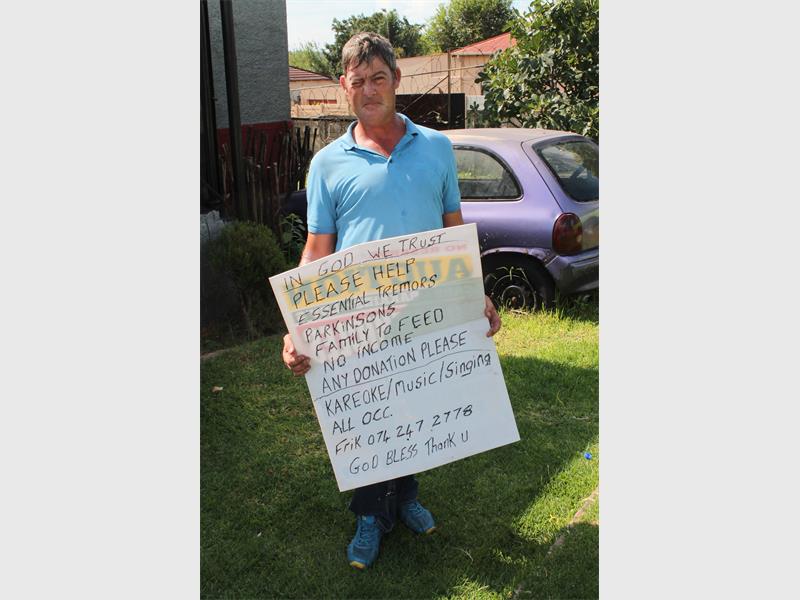 Frederick van Staden, 42, wat die afgelope agt jaar gereeld daar staan, se lewensverhaal is verbysterend. Op negejarige ouderdom is Frederick deur ‘n motor raakgery. Sy arm het aan die motor se buffer vasgehaak en hy is teen ‘n spoed van 140km/h omtrent 14m ver gesleep. Sy kop het herhaaldelik teen die padoppervlak gestamp en hy was 11 dae lank in ‘n koma. Toe hy wakker word het hy twee beroerte-aanvalle gehad. Dit het veroorsaak dat hy essensiële tremors, ‘n vorm van Parkinson se siekte kry. Hy het breinskade opgedoen en volgens Frederick het die medikasie nie gehelp nie.