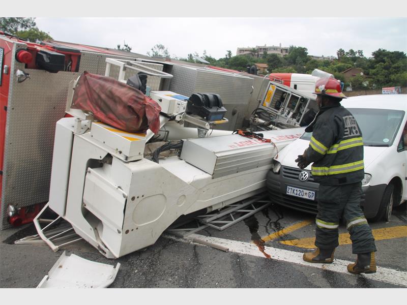Fire truck falls on car in six vehicle accident