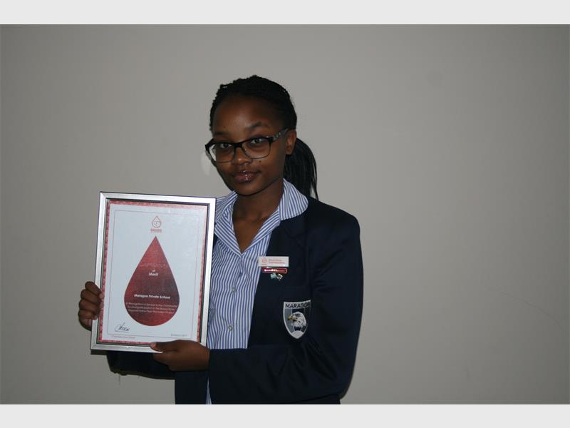 Maragon’s Vice-chairperson for the blood drive, Kyla Malotana, who is in Grade 11, accepted the award on behalf of the school.