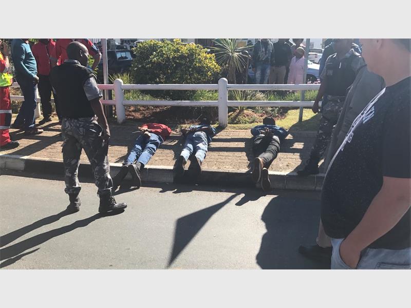 At the intersection of Ontdekkers and Gordon Roads the suspects skipped a red traffic light and collided with two other vehicles. The three suspects were arrested by Apcan Security before being handed over to Florida Police.