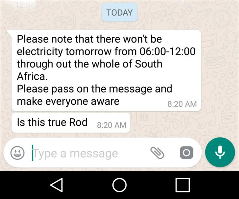 A mere two weeks after a WhatsApp about children being abducted caused mass hysteria, another hoax message, this time about a nationwide power outage, is being circulated.