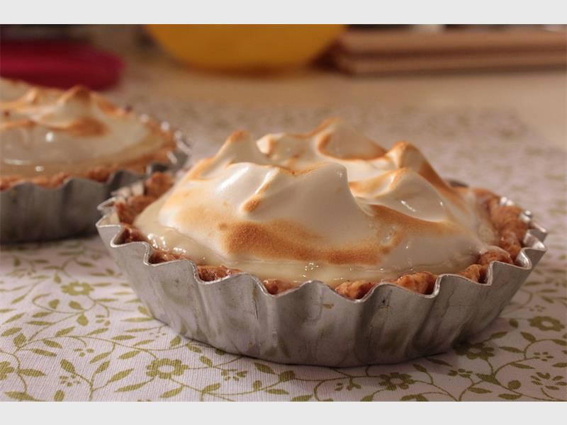 The shortcrust pastry is prepared beforehand and baked lightly to the colour of a light cookie, before the pie is constructed, by mixing together egg yolks, cream, sugar and lemon juice. The fluffy meringue that goes on top of the pie, is made by beating egg whites, cream of tartar and sugar (added at the right time to create a fluffy meringue). The baker knows the meringue is ready when stiff peaks are created.