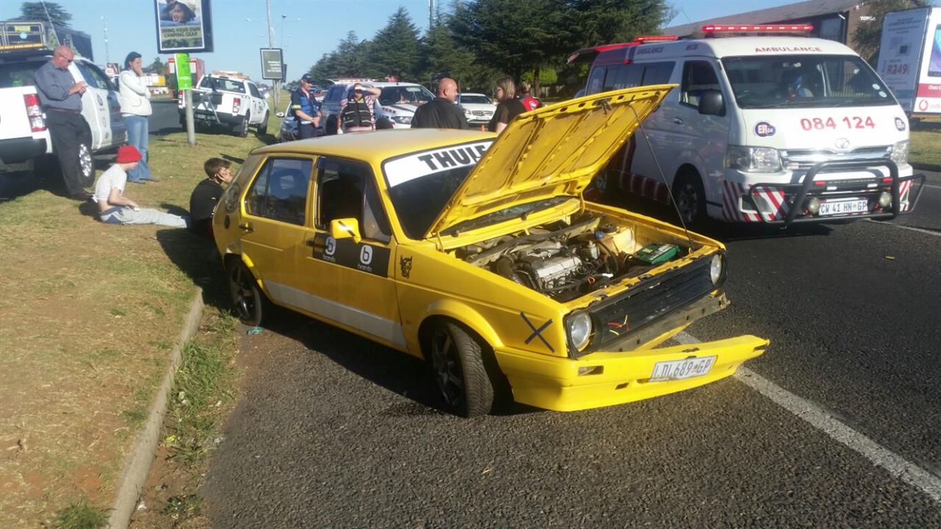 It is alleged that the driver of the VW Golf, who is in his late teens or early 20s, was racing when it turned in front of another vehicle at the corner of Ontdekkers Road and Sonop Street. After the two vehicles collided, the Golf ran over a traffic island where it hit the pedestrian. The pedestrian broke his leg and pelvis.