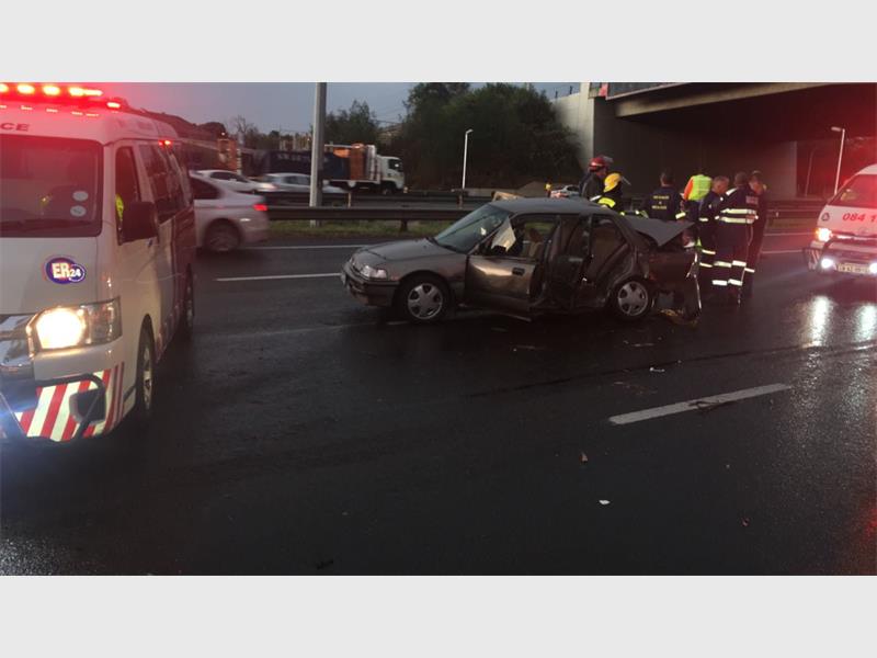 ER24 paramedics, along with other services, arrived on the scene at 5.25pm and found the two light motor vehicle in the middle of the highway.Upon closer inspection, paramedics found a woman, believed to be in her 20s, lying trapped inside her vehicle. Two other patients were found walking around on the scene.