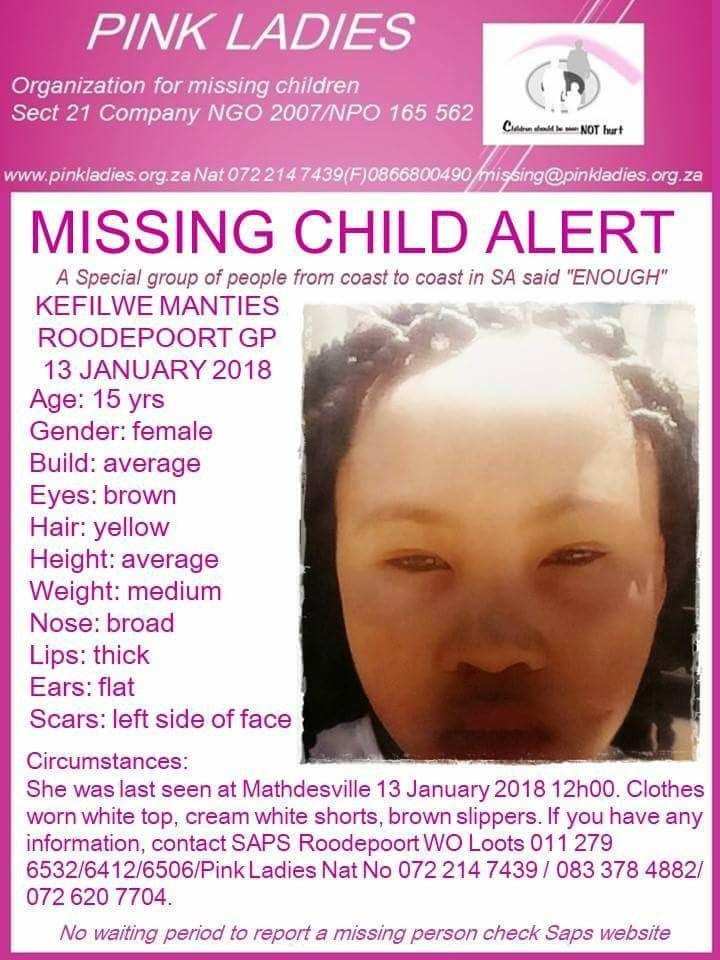 Anyone with information on her whereabouts is requested to contact Warrant Officer Loots on 011 279 6532/ 6412/ 6506.