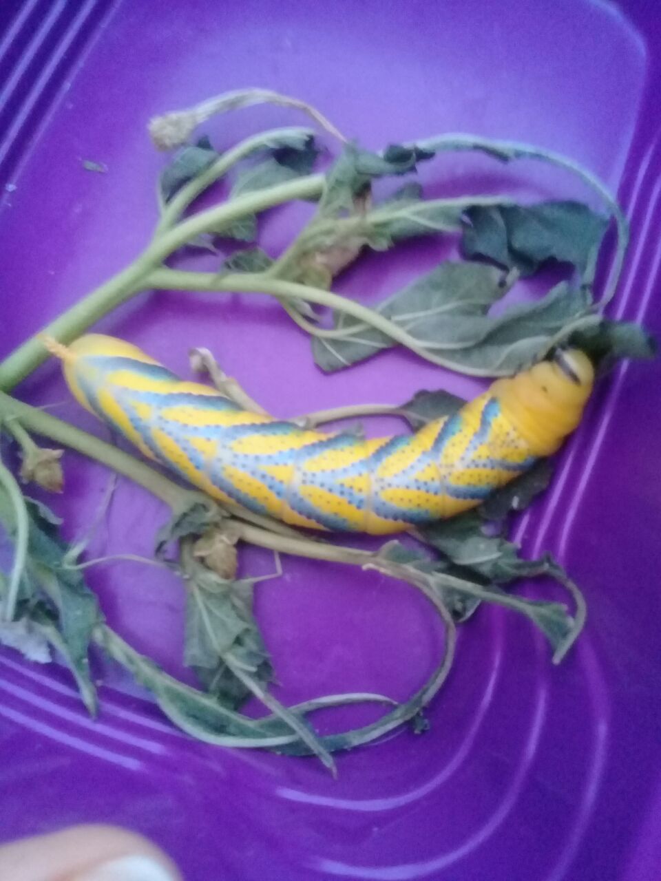 Petra and Alwyn van Zyl were spending some quality time in the garden with their grandson Sebastian Smit, who was visiting from Cape Town, when they came across a brightly coloured yellow and blue caterpillar the size of a small banana. After much research they found out that it was a death’s head hawk moth caterpillar.