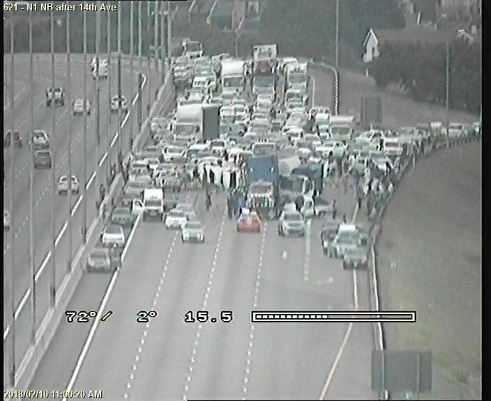 UPDATE 16:11 – One lane has been opened past the scene after 14th Avenue. Expect heavy delays.