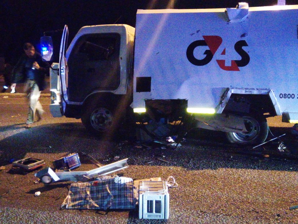 Although the police have yet to release an official statement, it is alleged that six suspects in three vehicles forced a GS4 van off the road. Some men with AK47s stopped traffic while the other used explosives to open the van. Shots were fired but it is alleged that only one of the security officers was hit in the arm.
