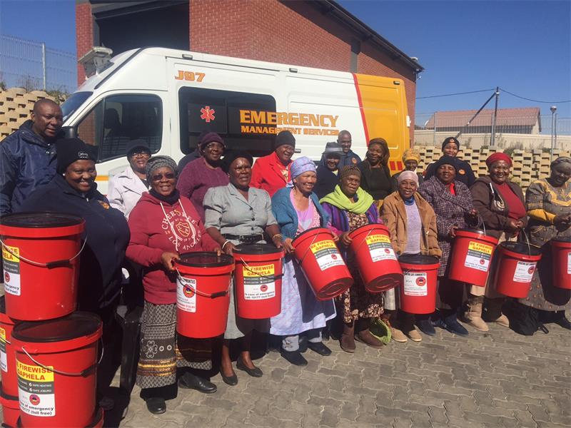 A Jozi fire kit consisting of a bucket, burn kit, Parasafe stove, paraffin containers and many more items was handed over to 50 elderly residents of Cosmo City on 15 June.