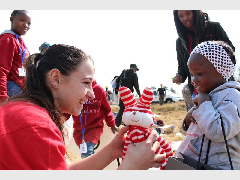 Helen McDonald from MyNeighbour giving a shirt to Beauty Maake during the street stall event at Plot 323. Photo: Siso Naile.
