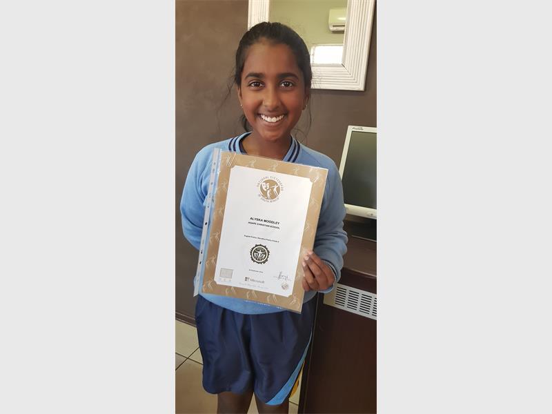 The Grade 5 Agape Christian School learner was awarded gold in the category Poetry: Narrative Poetry Grade 5. Her school is very proud Alyska’s excellent achievement and because she has put her school on the map.