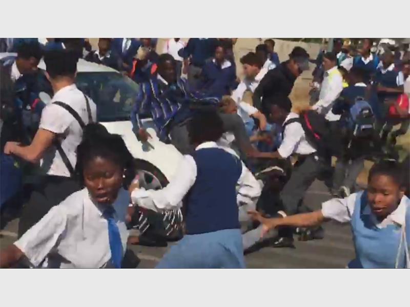 The chaotic scene on the road outside Allen Glen High School during an alleged brawl between learners saw some of them walking home with bruises after they were run over by a vehicle.