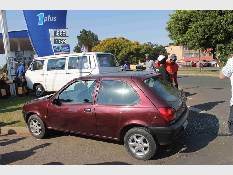 This morning, a taxi was travelling on Ham Street in the direction of Corlett Avenue when its driver allegedly ignored the stop sign. When they realised that they were going to collide, both the taxi driver and a woman travelling on Generaal Pienaar Avenue swerved but the taxi still collided with the car. The taxi ended up in the little garden in front of the Engen garage.