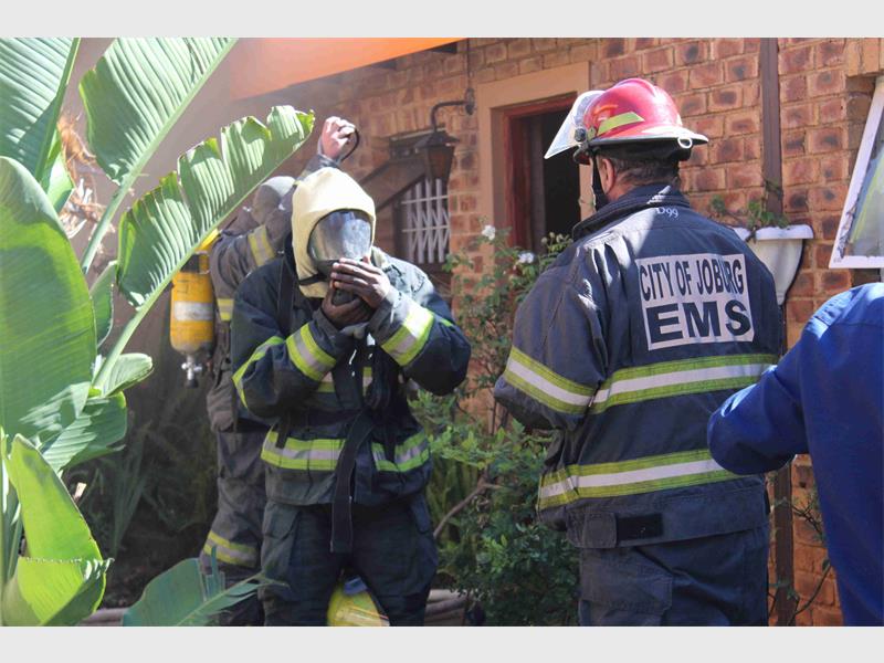 A firefighter fixes his mask before heading into the house. Photo: Blake Linder. City of Joburg