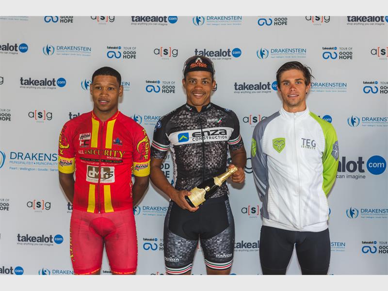 South Africa’s premier road tour got under way in inclement weather near Paarl in the Cape Winelands, but that did not stop the elite category going out with guns blazing on the short 58,5km first stage. Riding for Team Enza after securing a sponsorship with Enza Construction, Hoffman edged his rivals in the final dash for the line, finishing in 1:18:18.