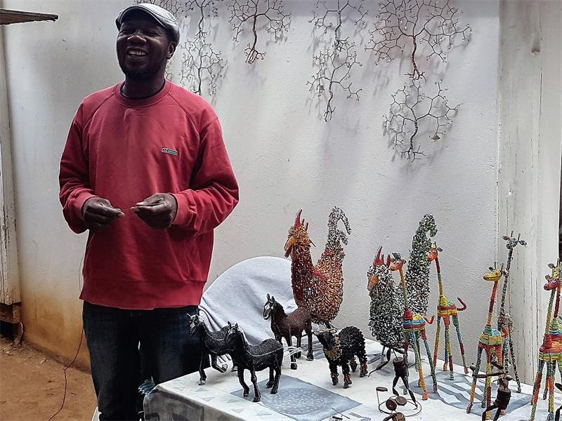Joseph is an innovative and environmentally friendly artist who uses recyclable materials and transforms them into beautiful bead and wire works which he sells at Ngwenya Glass Village in Muldersdrift.