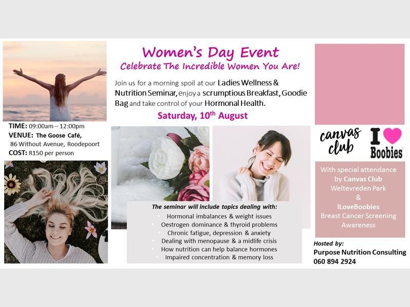 Purpose Nutrition Consulting will be hosting a Women’s Day Event on Saturday, 10 August at The Goose Café in Roodepoort.