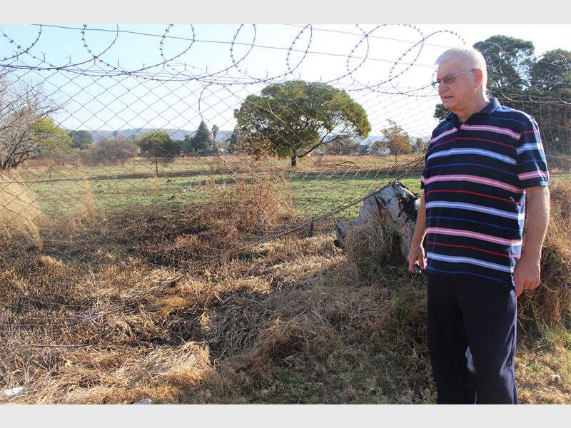 The concerned resident, Jannie Strydom, whose property is a stone’s throw away from this vacant piece of ground with its huge but damaged fence, is extremely unhappy about the lack of maintenance on the property, which he said has lured vagrants.