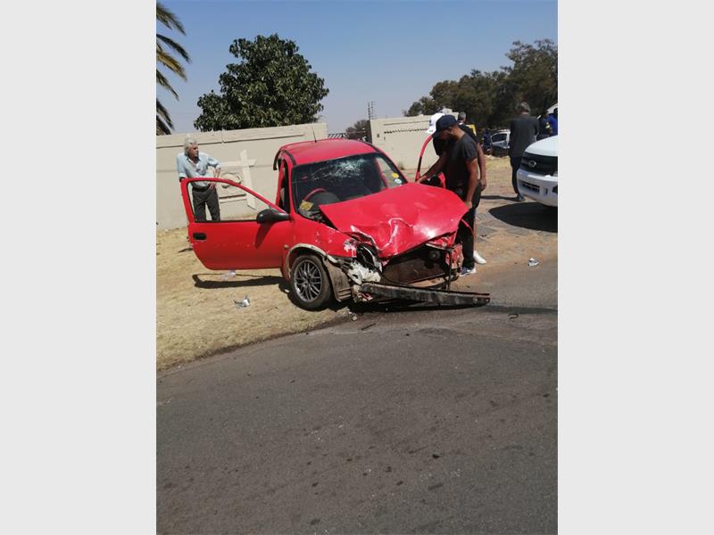 Two vehicles collided at the corner of Prosperity Road and Chaucer Avenue in Grobler Park today,Wednesday, 28 August. The driver of an Opel Corsa failed to stop at the stop street and collided with a bakkie while travelling at high speed.