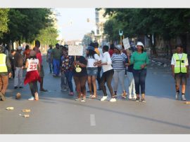 With several roads blocked with rocks and burning tyres, delays in traffic are evident on Albertina Sisulu Road, Van Wyk Street, Maré Street and Dumat Street.