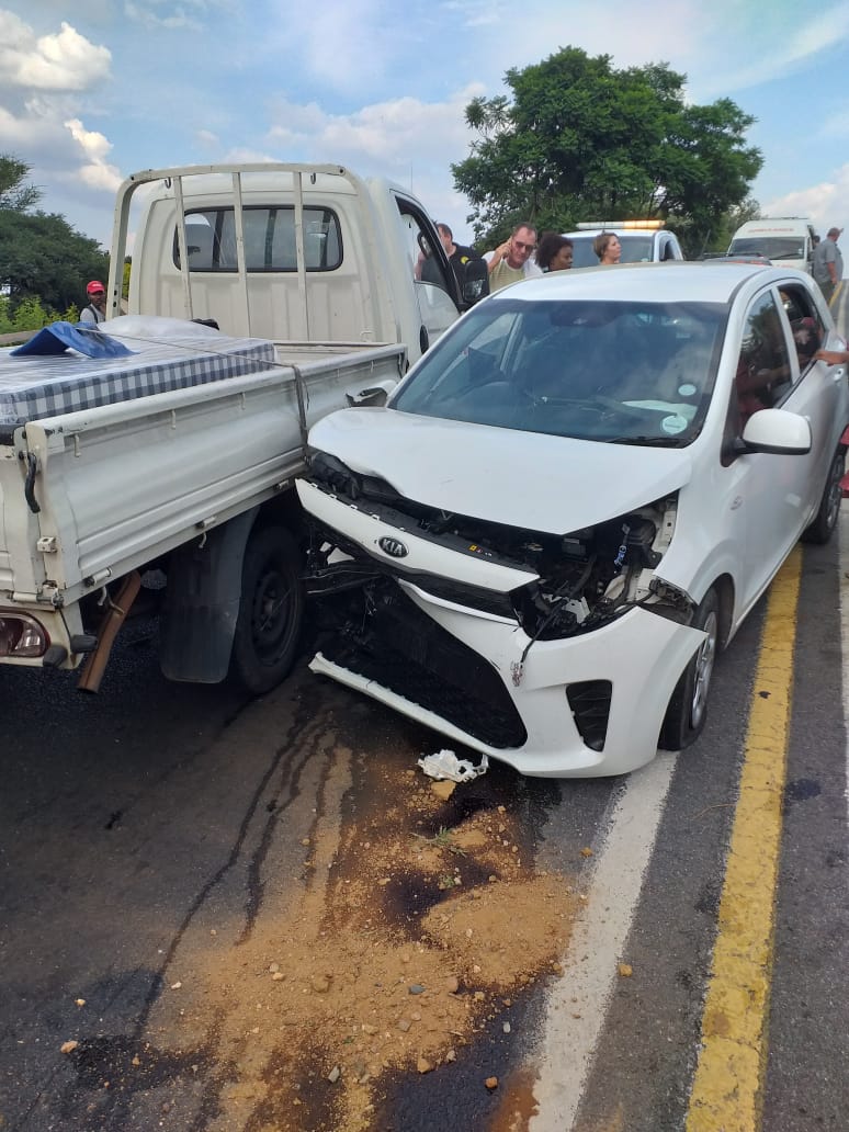 An accident involving three vehicles blocked much of the main arterial used by the bulk of Roodepoort residents. A partial head on collision saw three vehicles damaged with one hatchback being lodged under small delivery truck.