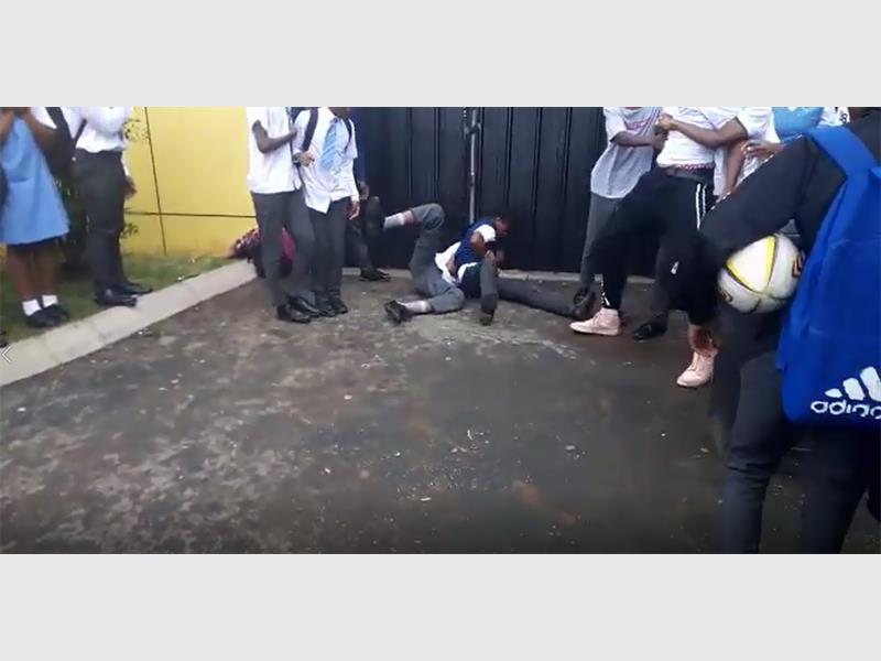 A video shared with the Northsider depicts a scene of complete pandemonium outside the school, where learners dressed in school uniform and other people in casual clothes were cheering on the victim and the aggressor to take each other down. The learners casually passed around a cigarette while having a good laugh.