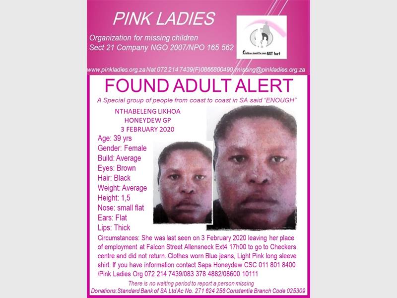 Thirty-nine-year-old Nthabeleng Likhoa from Honeydew who went missing on 3 February has been found safe and alive at Helen Joseph Hospital.