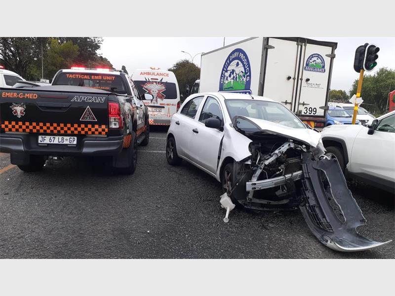 The collision involved two light motor vehicles and a motorcycle. Fortunately the motorcyclist escaped unharmed, but the two occupants of the light motor vehicles sustained moderate injuries. Alett Reed of Emer-G-Med confirmed the incident saying, “The patients are currently being treated on scene by Emer-G-Med and ER24 and will be transported to hospital”.