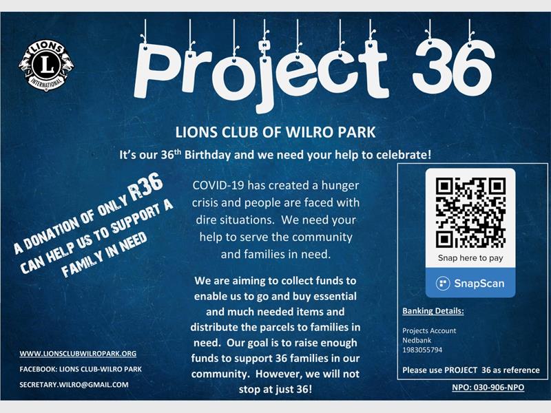 The monetary donations will go towards buying food and essential items for the families who are struggling and hungry during this time. The Wilro Lions have been able to outline that food parcels per family will cost R36.