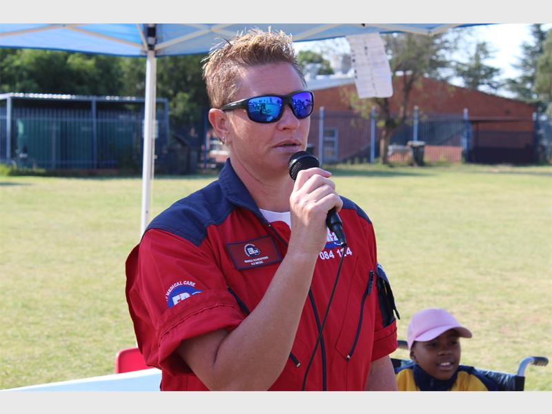 Marga Scheepers from ER24 facilitated the demonstration where they showed the learners how the team members carry a victim into the ambulance. The demonstration allowed everyone a peek into the life of the medical response team and what they do when responding to an emergency call.