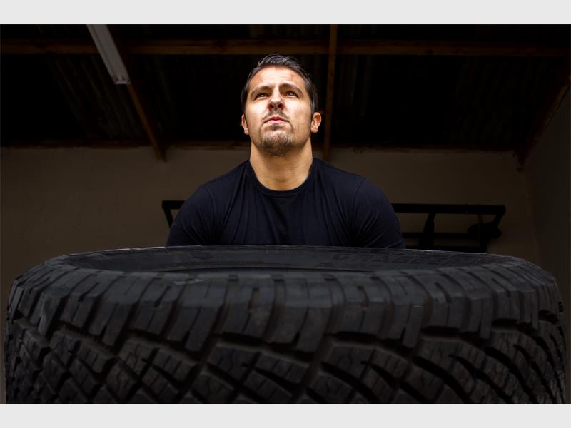 “I start off with a 700m run, which is comprised of seven uphill sprints to the gate, and another seven downhill toward the garage gym. I use the step counter on my smartphone, as I’ve noticed that running apps which use GPS aren’t very accurate for short sprints like these. Directly from there I jump into 10 weighted squats with a 30 or 50kg barbel, and do a one to two minute planking session. I do a quick, one-minute rest during which I check the timer on my phone and mark my first completed section’s time on a sheet. Then follows another 700m run, 80m tyre drag (35kg) up- and downhill, one minute rest, 10 squat box-jumps, a 500m run, two minutes rest, a 50m Atlas carry with those same tyres up- and downhill, 700m run, three minutes rest, 10 repetitions of 50kg weighted overhead thrusters, 50 up- and downhill tyre flips, three minutes rest, 700m run, two minutes rest (as I’m pretty tired right before my second wind kicks in), 20 burpees, 1km run, one minute rest, one minute pinch plate, one minute shoulder rolls/ shrugs (about now my shoulders are killing me), no rest as I do 10 tyre flips on a flat surface, a 700m run, and end it all off, while panting heavily, with a five-minute, no pause, high-intensity boxing session.