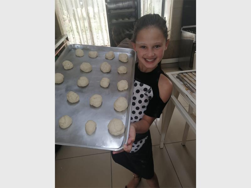 Chantè Nel, 9, ‘n finalis in die Mej Randfontein 2020-kompetisie, is besig om haar deel te doen vir die gemeenskap deur brood te bak vir inwoners van Venterspos.