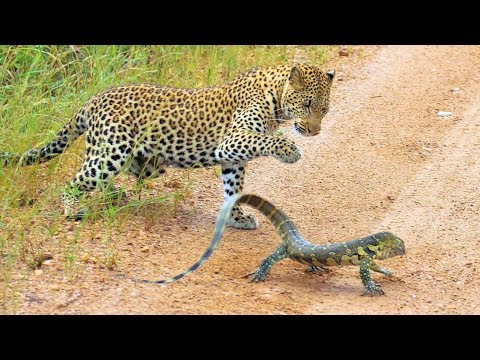 Leopard cub gets slapped around by lizard