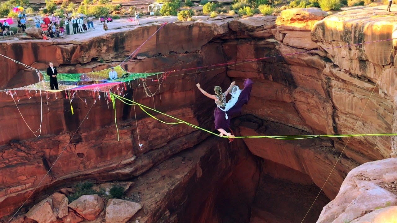 Bride And Groom Slackline 400 Feet Above Canyon Floor To Their Wedding