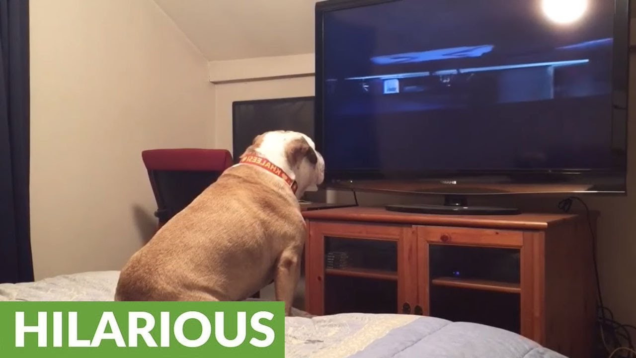 See what this bulldog does while watching a horror movie