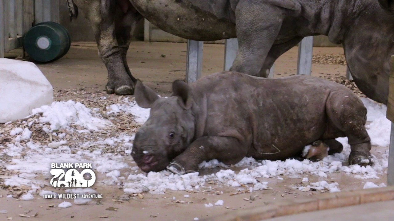 Baby rhino discovers snow